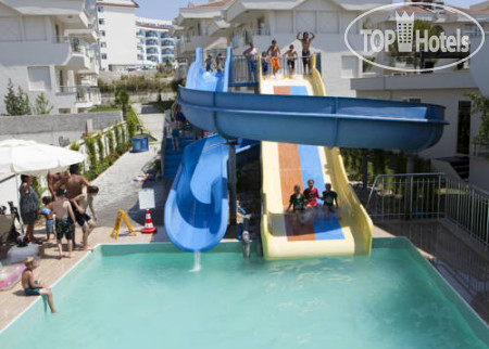 Главный отель с лобби, отдельные домики 3-4 этажные по 2 комнаты на этаж (слышимость хорошая с соседнего балкона при закрытом балконе - нам не повезло, немцев заселили в последний день, они до 00:30 никак успокоится не могли), два места с бассейнами (есть для малышей, пользовались разок), маленький уголок с мини горками для детей 6 на 6 м.