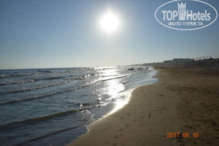 Много шезлонгов, все в основном в тени. Рядом могут лежать люди и курить ( как же я люблю немцев, то орут и спать не дают, то курят). Вход в море пологий, долго заходить, с детьми самое то. Песок. Половина времени море было грязное - очень много мини веточек, коры или темных водорослей (не знаю, что это), было неприятно.