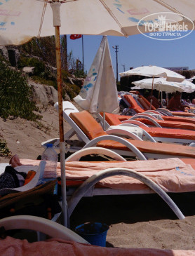 Пляж. Он немного выше моря, но есть спуск. Лежаки в 2 ряда. Всегда были свободные места. Зонты есть. Бары есть вдоль береговой линии, но за деньги. Единственное чего не хватало именно нам - крана ополоснуть ноги, иногда пользовались кранами вдоль берега, но иногда выгоняли (типа вы не с этого отеля).