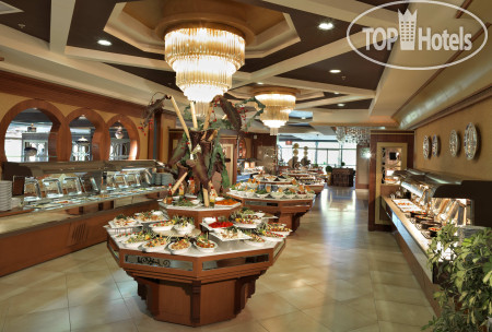 Питание и бары. Баров много, сопровождают на всем пути от Golf до пляжа. Это собственно бар в лобби Golf, затем бар в лобби Deluxe. Там же кондитерская, работающая до 22:30, спускаемся по чудесной затейливой лестнице (народ там фотографируется постоянно), оглядываемся назад под лестницу, там еще один бар. Движемся далее, тут череда магазинов (куда без них!?), далее слева - кофейня, ценители утверждают, что там лучший кофе в отеле, справа - булочная. Выходим из здания отеля, впереди выдача полотенец, но зачем их тут брать, можно это сделать ближе к пляжу, там есть кабина выдачи. Полотенца пляжные новые свежие, видно по пришитым биркам, брендированные, выдают без карточек. Тащить сдавать их не нужно, оставляешь на лежаках. Далее снова бар, вечером на больших экранах спортивные мероприятия, движемся по длинному мосту, смотрим влево – там тоже бар. Наверняка какой-то пропустил. Количество и качество напитков везде одинаковое, то есть полное. Еда. Отлично. Было все: мясо, рыба, морепродукты (как в блюдах, так и отдельная подача). Завтракать можно как в Golf, так и в Deluxe, но в Golf поспокойнее, бонусом рыбок можно чудесных, здоровенных разноцветных карпов кормить. Яичницу готовят лучше в Golf, красная рыба была, сыр с плесенью был, тонко нарезанное, похожее на карпаччо, мясо говядины было. И много чего еще. Обед. Обедать можно в Golf по меню: тут суп дня, стейки из красной рыбы, стейки из говядины, пицца. Далее чудесное место и интересная задумка – это площадь Sueno. Череда киосков с блюдами как турецкой, так и международной кухонь, порционное мороженое, вафли, супы, готовые продукты с гриля, напитки в банках, вино белое-розовое-красное-игристое. В полдень там жарко, персонал отеля установил вентиляторные установки, но их не хватало. Можно отобедать в главном ресторане, предложение блюд там меньше, чем на ужин, зато приятные и разнообразные залы приемы пищи, и стоит ли писать, что они все кондиционируемые. Ужин. Тут все побогаче, разнообразней. Блюд просто огромное количество, и так пишу уже долго. Работают оба ресторана в обоих отелях. Нужны тишина и спокойствие – вам в Golf, нужен простор, шум и выбор блюд, больше чем в Golf, тогда отправляйтесь в Deluxe.