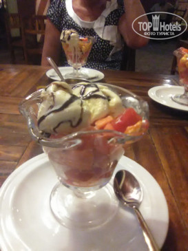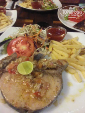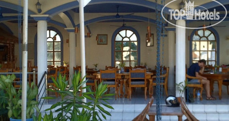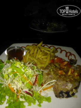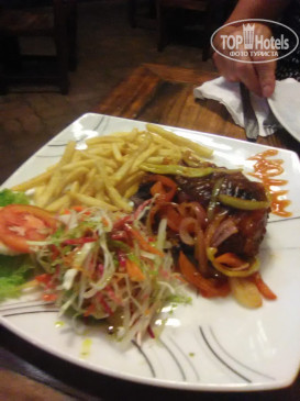 РЕСТОРАН чистенький и уютный, с картинами на стенах и музыкой. Персонал всегда приветлив и улыбчив. Если вы берете с питанием, то будьте готовы к скромному завтраку (яичница/омлет с беконом, масло, джем, хлеб, стакан сока и на выбор чашка чая или кофе). В отличие от завтрака ужины тут отменные: комплексные, с большими порциями. Отмечу, что готовят тут очень вкусно. Один минус - долго! Будьте готовы убить на ужин час, а то и полтора: про ваш заказ могут забыть, принести салат после основного блюда и прочие казусы, особенно при полной загрузке ресторана. Кроме постояльцев в ресторане обслуживают любого со стороны. А т.к. генераторы есть не во всех кафешках/ресторанах, то при отключении света, тут аншлаг.