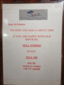 Всем привет! Хочу рассказать о пребывании в отеле Paradise holiday village 3* в городе Негомбо. Туроператор анекс тур, а/к red wings . Отель выбирался исключительно по отзывам, но был упущен тот момент, что а/к Red Wings прилетает не в аэропорт г.Коломбо, что в 40 км, а в аэропорт г. Маталла, расположенный на юге острова, а это 280 км от Негомбо или 5 часов на автобусе из аэропорта…(вот тут то был просчет, ибо день прилета был потерян ). Прилетели в 13.30, но в отеле были только в 19ч вечера.. Также обратно, вылет в 16ч - забор с отеля в 8:30 утра… И того из 10 дней вышло 8..Перелет с Екатеринбурга занял 7,5 часов, но по прилету принимающая сторона Анекс даже не удосужилась раздать бутылочки с водой туристам, зная что всем ехать еще тучу времени до отелей, а предложили купить их за 1$ (повезло тем, у кого были мелкие деньги с собой). Отель понравился! Большая территория! Внутри сад! Чистый бассейн, рядом душ и краны для ног, смывать песок после пляжа. При отеле есть ресторанчик, из окон было видно, что там относительно чистая кухня (по сравнению с тем, что вы можете наблюдать в других кафешках вдоль пляжа и в каких условиях там готовят), иногда лучше не этого просто не знать)). Ценник средний, омлет 750-800рупий (делить на 3), креветки везде около 2500-2800, стейк из тунца,что на фото- 2250рупий, свежевыжатый сок 700-800рупий. Для того, чтобы убрали в номере необходимо просить на ресепшене и отдавать им ключи (ибо первые 4 дня я этого не знала и всё ждала, когда они придут убирать). Из уборки не понравилось только, что они не помыли полы, за 10 дней полы очень натоптались. В моем номере не было шкафа, но в другом номере стандарт шкаф был. Слышимость отличная, особенно как кричат вороны по утрам). Сад и цветы поливали каждый день. В бассейне можно купаться хоть ночью. Живности в номере не было. До пляжа минуты 4 пешком. Пляж сам по себе хороший, широкий, большой, на пляже стоит отель 5*, поэтому его убирают, но как говорится -шаг влево, шаг вправо и мы видим истинную картину мира: считаю, что местные жители сами засирают свою же территорию- везде валяется пластик, пакеты, бутылки и пр. Особенно если пойти направо от пляжа, где тусуются местные рыбаки. В день прилета на пляже была местная свадьба, около часа громыхали салюты и вот утром весь песок был усыпан палочками от пиротехники, естественно весь этот мусор никто из местных за собой не убрал. Печально смотреть на то, как человек гадит там, где он живет. По пляжу ходят продавцы всякой фигни, Они конечно приставучие, но если им сказать громкое Bye! - они уходят. Цены у них завышены раз в 6 там, например пляжные сарафаны они продают за 5 тыс рупий, утверждая, что это хэндмэй. Вообще местные жители мне показались довольно неплохими ребятами, они не такие дикие как в Индии, стараются быть участными, жулики конечно тоже есть , особенно среди таксистов, завышают цену раза в 3. Пользуйтесь приложением pic me для вызова тук туков. До центра Негомбо (4,5 км) можно дойти пешком или доехать на тук туке (цена максимум 300 рупий или 100р на рубли). А так они могут назвать цену и в 1000 рупий! Магазины с одеждой в Негомбо - no limit, mom’s fashion, price on и другие, они находятся все рядом, если посмотреть по карте. Из фруктов продают ананасы, мини бананы, гуаву, папайю. Манго не встречала. Если остались рупии- их можно на обратном пути поменять в аэропорту (курс правда похуже , но всё же). Аэропорт г. Матала очень маленький, дь