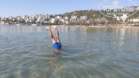 Пляж: пожалуй, единственный плюс, до моря 1 минута. Хотя походить было бы неплохо. Пляж свой, лежаков хватает, если заняты все лежаки отеля, то сотрудник на пляже разместит вас на соседнем пляже. Полотенец не дают. Пляж относительно тихий, доносится музыка из бара, но не бьет по ушам. Единственное, рядом проводят дневные дискотеки, и после обеда довольно шумно. Сам пляж - это смесь песка и земли, в виде легкой насыпи. Глубокого песочка нет. Заход в море плавный, метров 100 по бедра, поэтому чтобы поплавать на глубине надо уйти далеко за буйки. В 35 минутах от отеля вдоль по набережной есть дикий пляж, там и волны, и тишина. Советуем туда сходить. Только лучше взять тапочки для кораллов, заход по гальке и большим камням. И сама дорога с камнями, торчащими из земли.